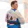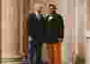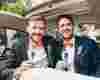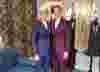 Chris and Tom opt for identical waistcoats while keeping their jackets complementary. Chris wears a blue jacket paired with Tom’s green one, both single-breasted with notch lapels, whilst their waistcoats are made from the same checked cloth and matching shawl lapels.