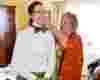 Becky and Sophie create a cohesive look by cleverly coordinating suit pieces in complementary colours. One of them pairs a burgundy waistcoat with their partner’s burgundy jacket, while the other wears a blue waistcoat to tie into their partner’s blue suit. However, they shared key style elements, both wearing single-breasted jackets with notch lapels, burgundy buttons, two slanted pockets, matching shoes and boutonnieres.