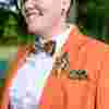 Our CEO and co-founder, Jake Allen, used satin from his wife’s bespoke wedding dress to create a double-breasted waistcoat with shawl lapel. Paired with a blue jacket and trousers, along with contrasting orange detailing on the lining and tie, his waistcoat was a subtle way to match his wife’s attire.